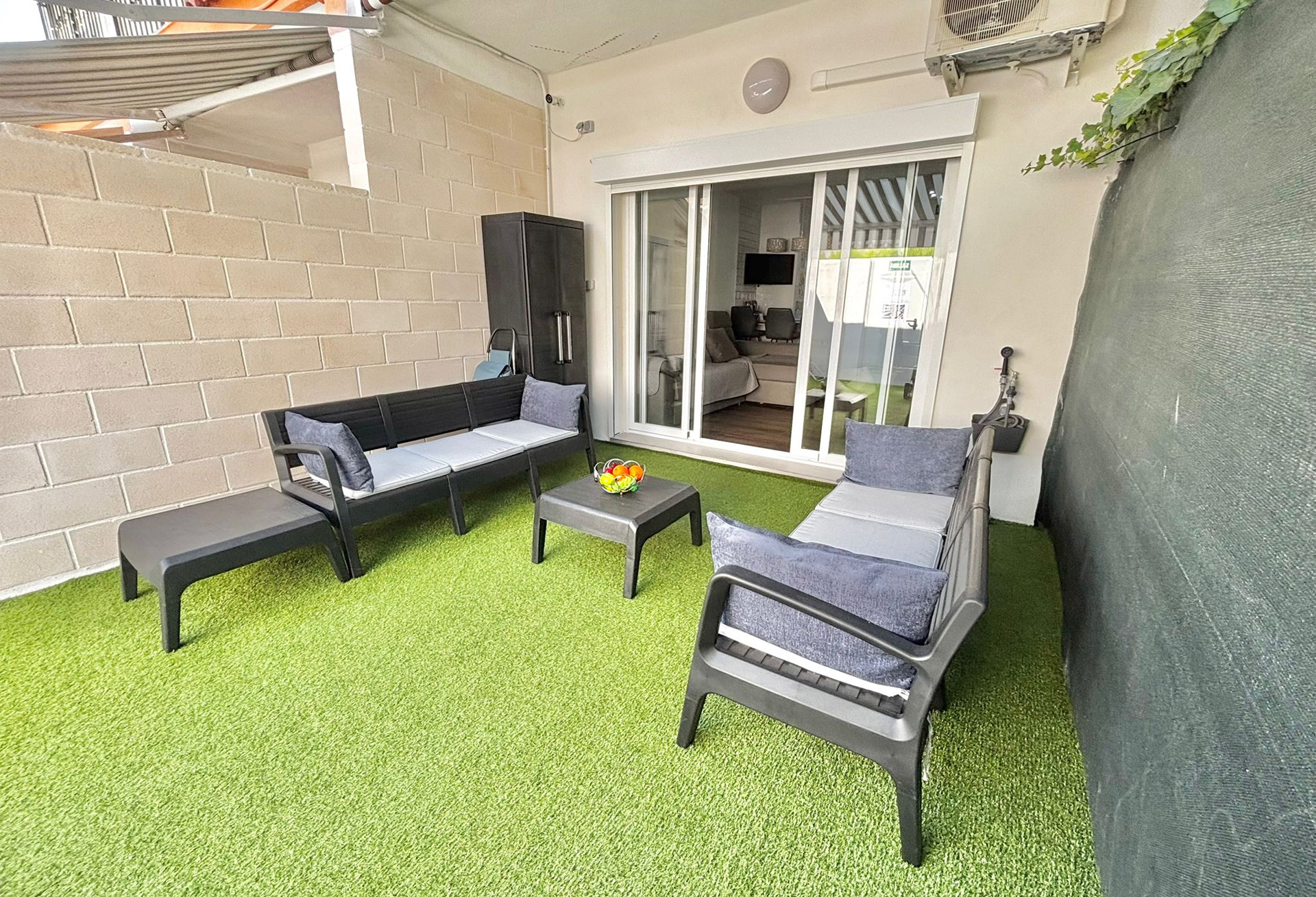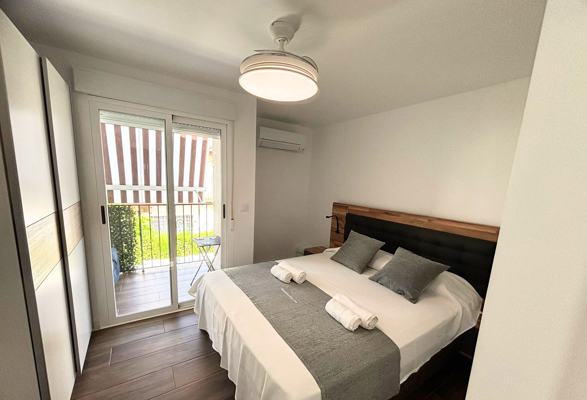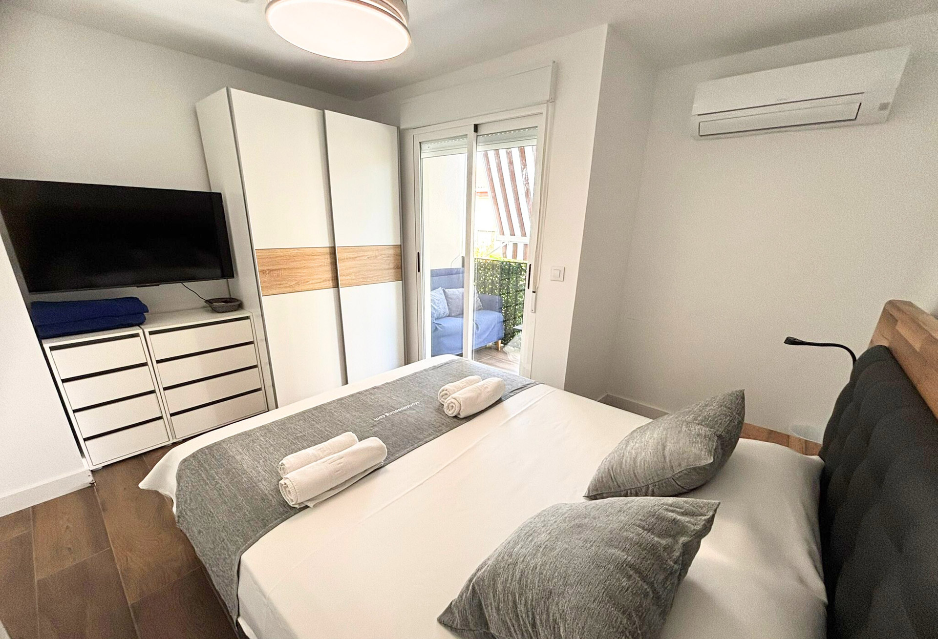 La zona de estar ofrece un cómodo sofá cama que amplía la capacidad del alojamiento, convirtiéndolo en el lugar perfecto para hasta 6 personas. Uno de los grandes atractivos es su terraza interior privada estilo chill out, un rincón encantador donde podrás relajarte después de un día de playa, leer un libro, tomar un cóctel o simplemente disfrutar de la brisa mediterránea en un entorno íntimo. Y para hacer la experiencia aún más especial, la habitación principal incluye un encantador balcón privado, ideal para disfrutar del café de la mañana o ver el atardecer.