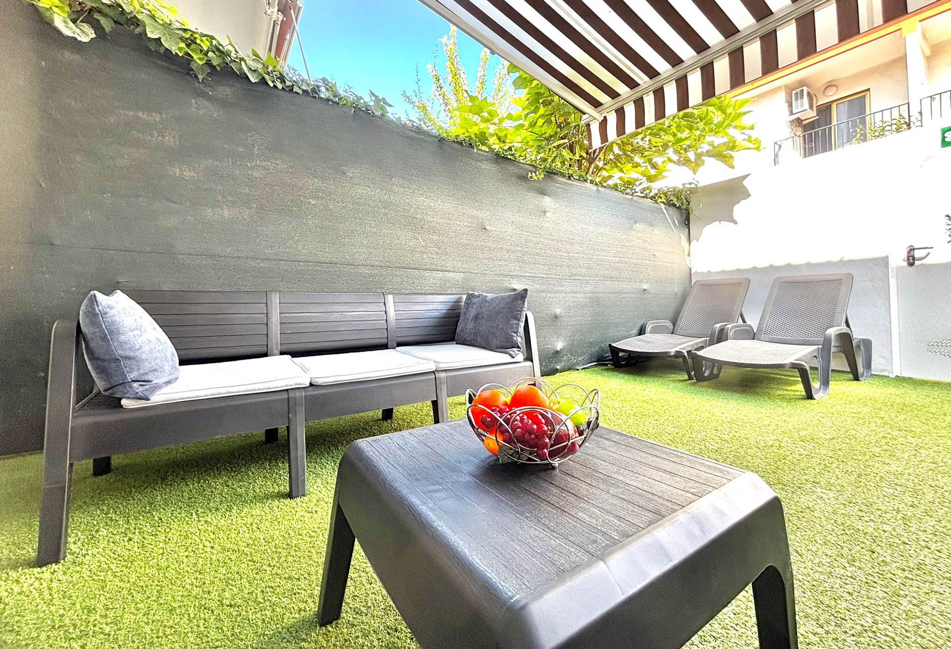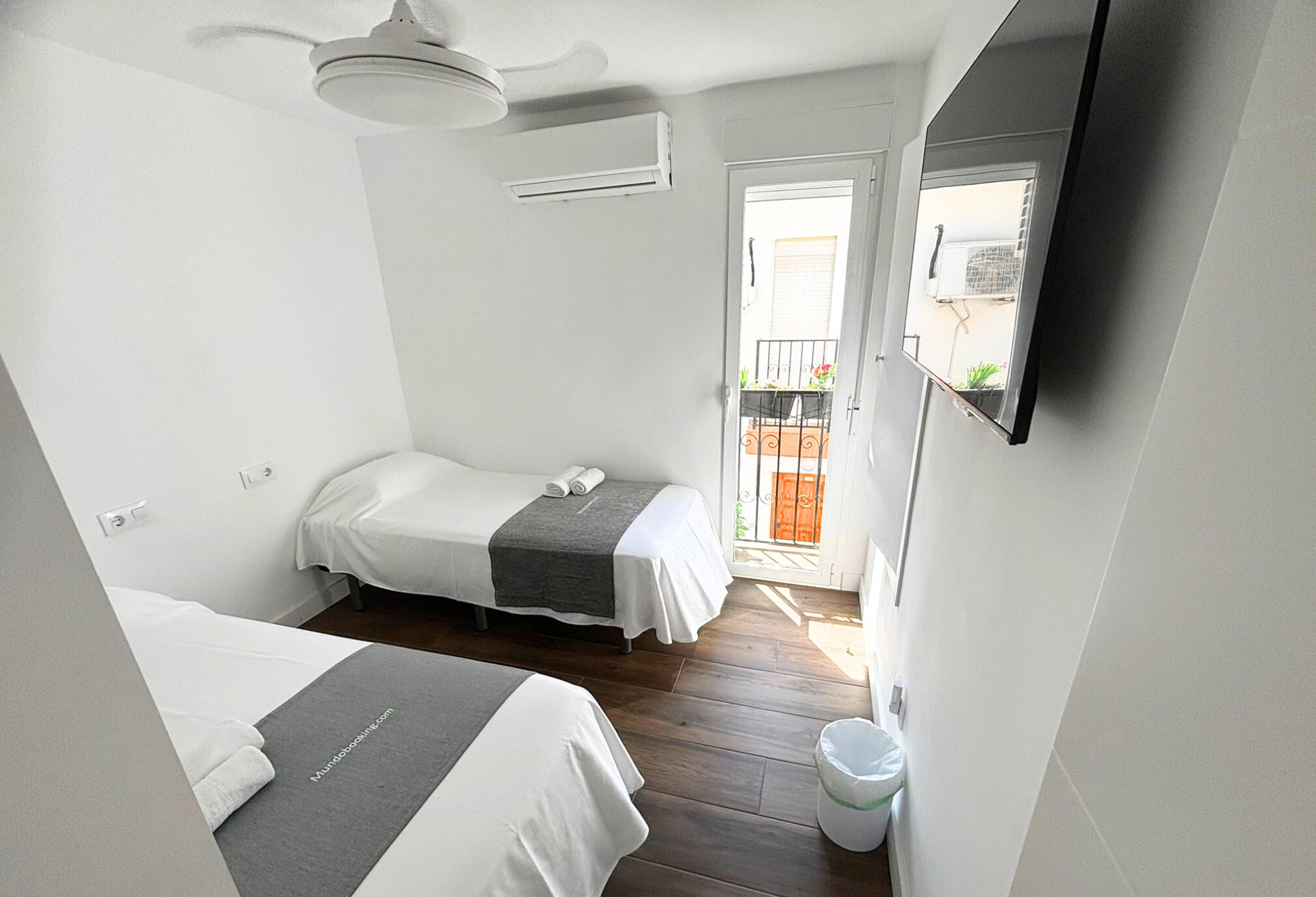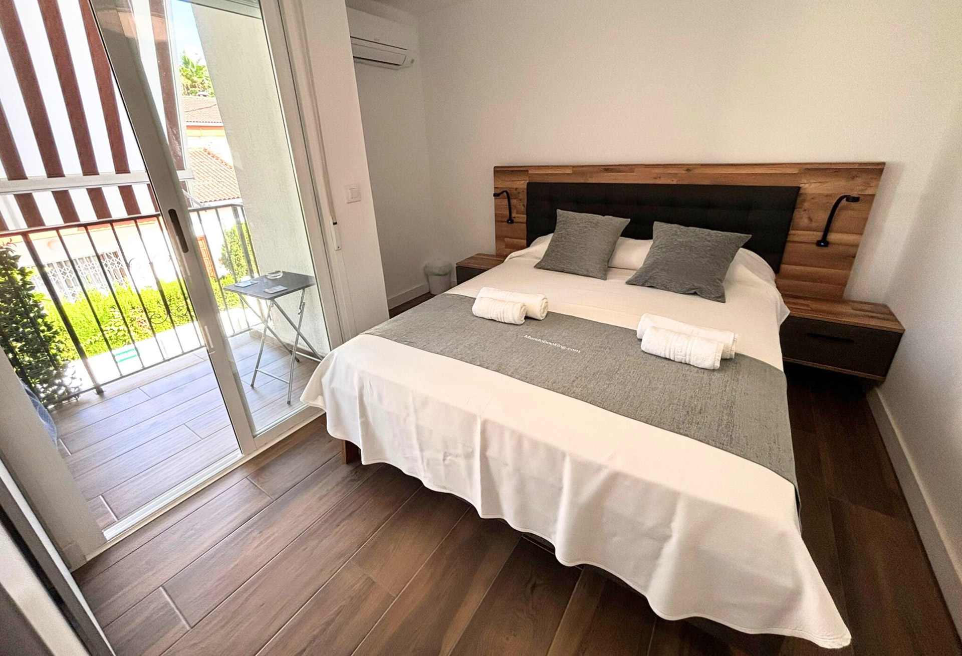La zona de estar ofrece un cómodo sofá cama que amplía la capacidad del alojamiento, convirtiéndolo en el lugar perfecto para hasta 6 personas. Uno de los grandes atractivos es su terraza interior privada estilo chill out, un rincón encantador donde podrás relajarte después de un día de playa, leer un libro, tomar un cóctel o simplemente disfrutar de la brisa mediterránea en un entorno íntimo. Y para hacer la experiencia aún más especial, la habitación principal incluye un encantador balcón privado, ideal para disfrutar del café de la mañana o ver el atardecer.